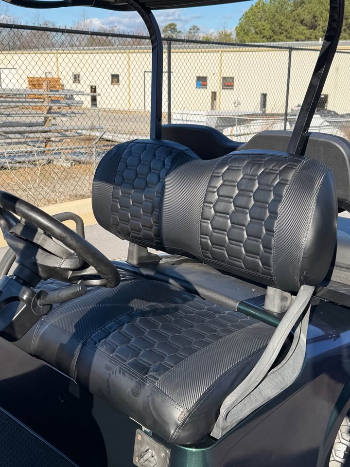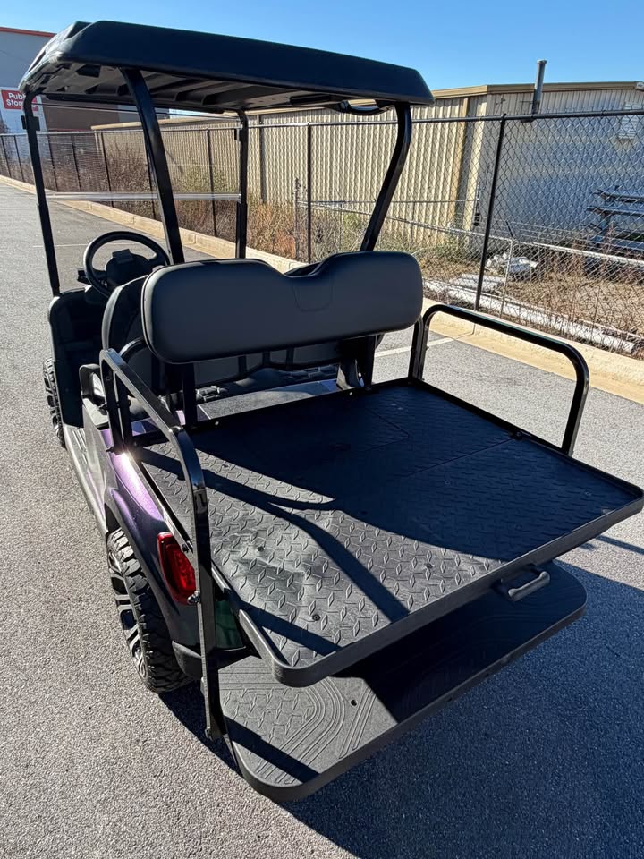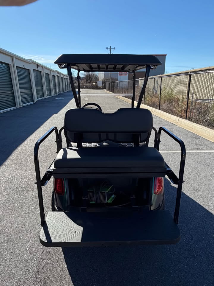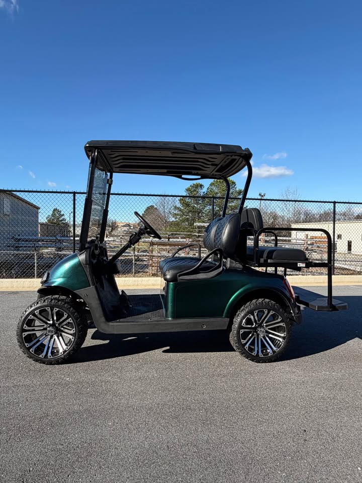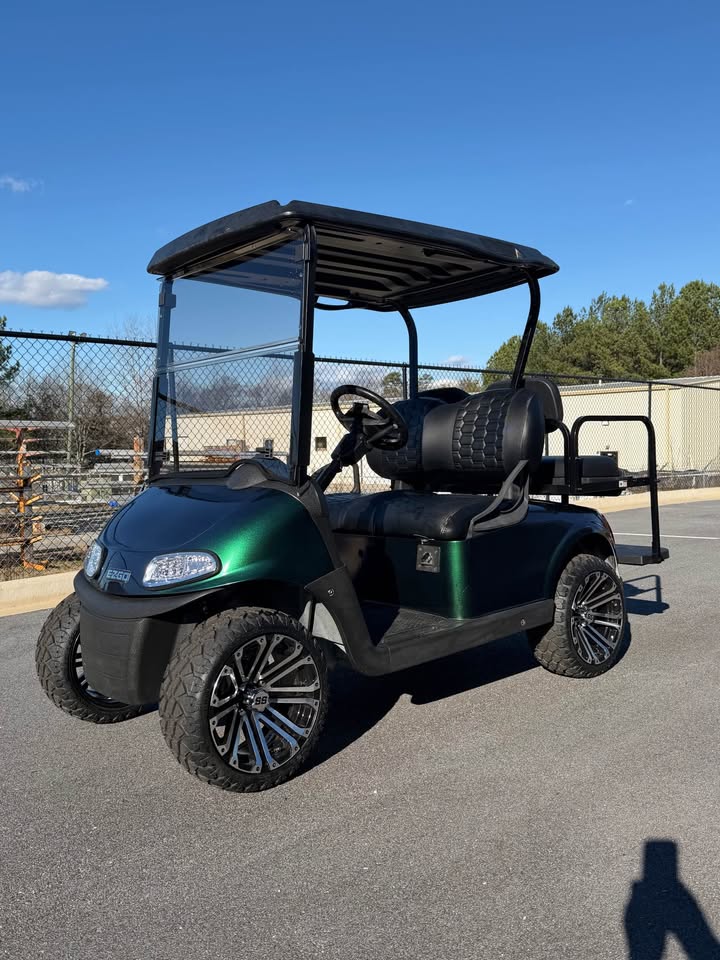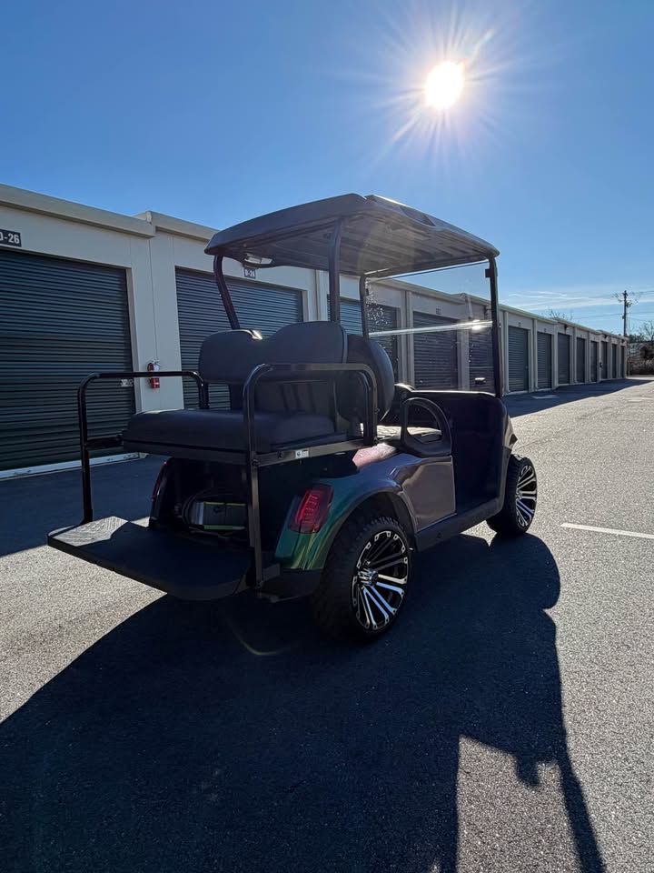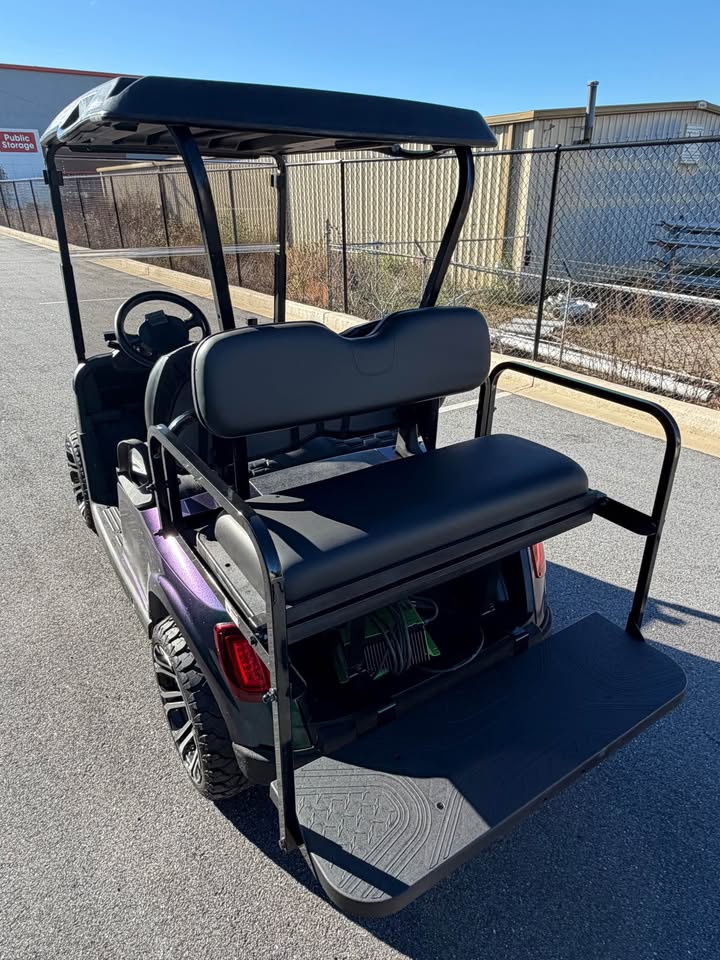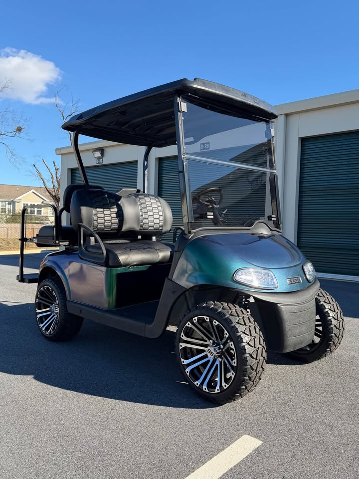 Make a statement with this 2019 EZ-GO RXV Elite Lithium Ion Golf Cart, featuring a custom metallic chameleon paint job that shifts beautifully from green to blue depending on the light. This is a truly one-of-a-kind cart, combining eye-catching style with elite electric performance.